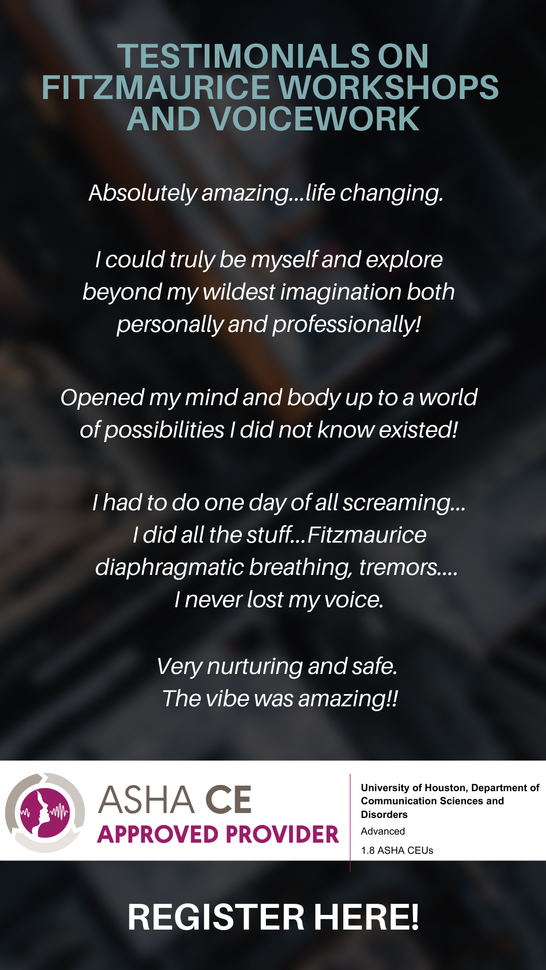 The effectiveness of Fitzmaurice Voicework is recognized and taught in leading acting and performance training programs around the world. The multidisciplinary nature of this course continues in the path of existing, well-established techniques of voice therapy whose sources are the performing arts.